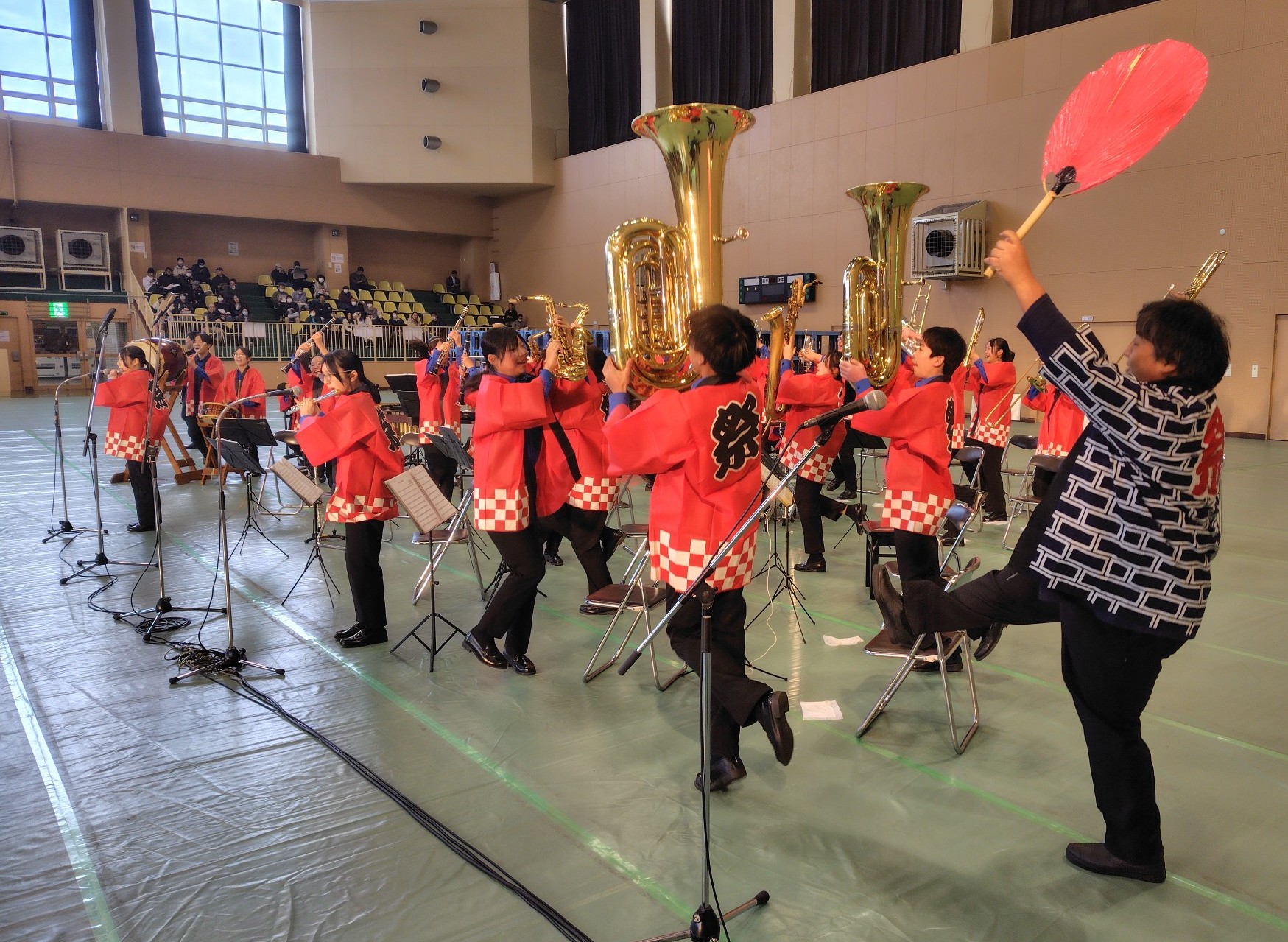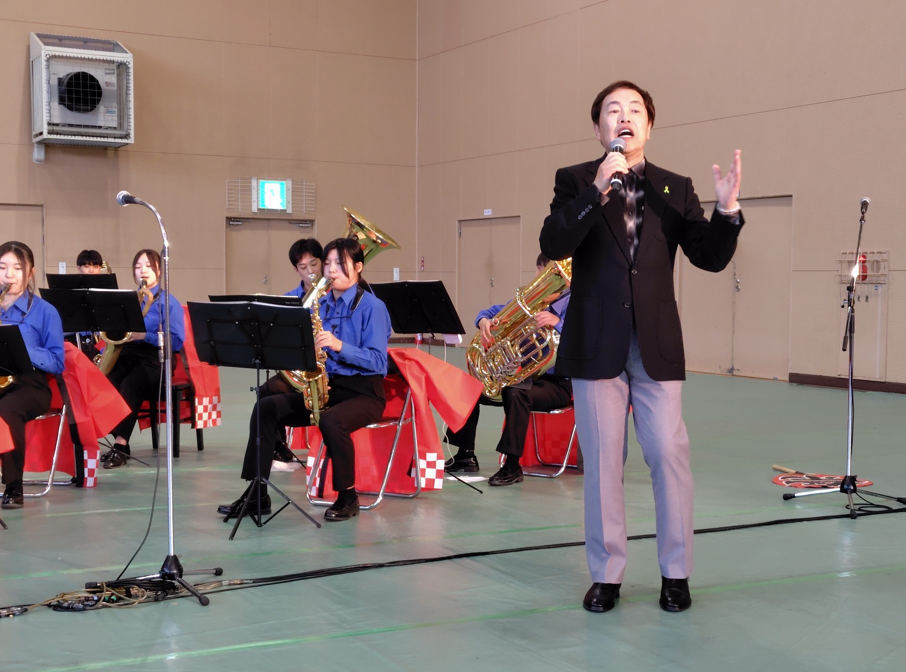 青梅市立第三中学校吹奏楽部の生演奏で会場の雰囲気が盛り上がる中、毎年恒例の歌手・三田りょうさんが、同吹奏楽部をバックに大会公式ソング『春呼ぶ祭典(まつり)』を熱唱。会場を埋めた観客からは熱い視線が注がれ、手拍子も湧き起こりました。