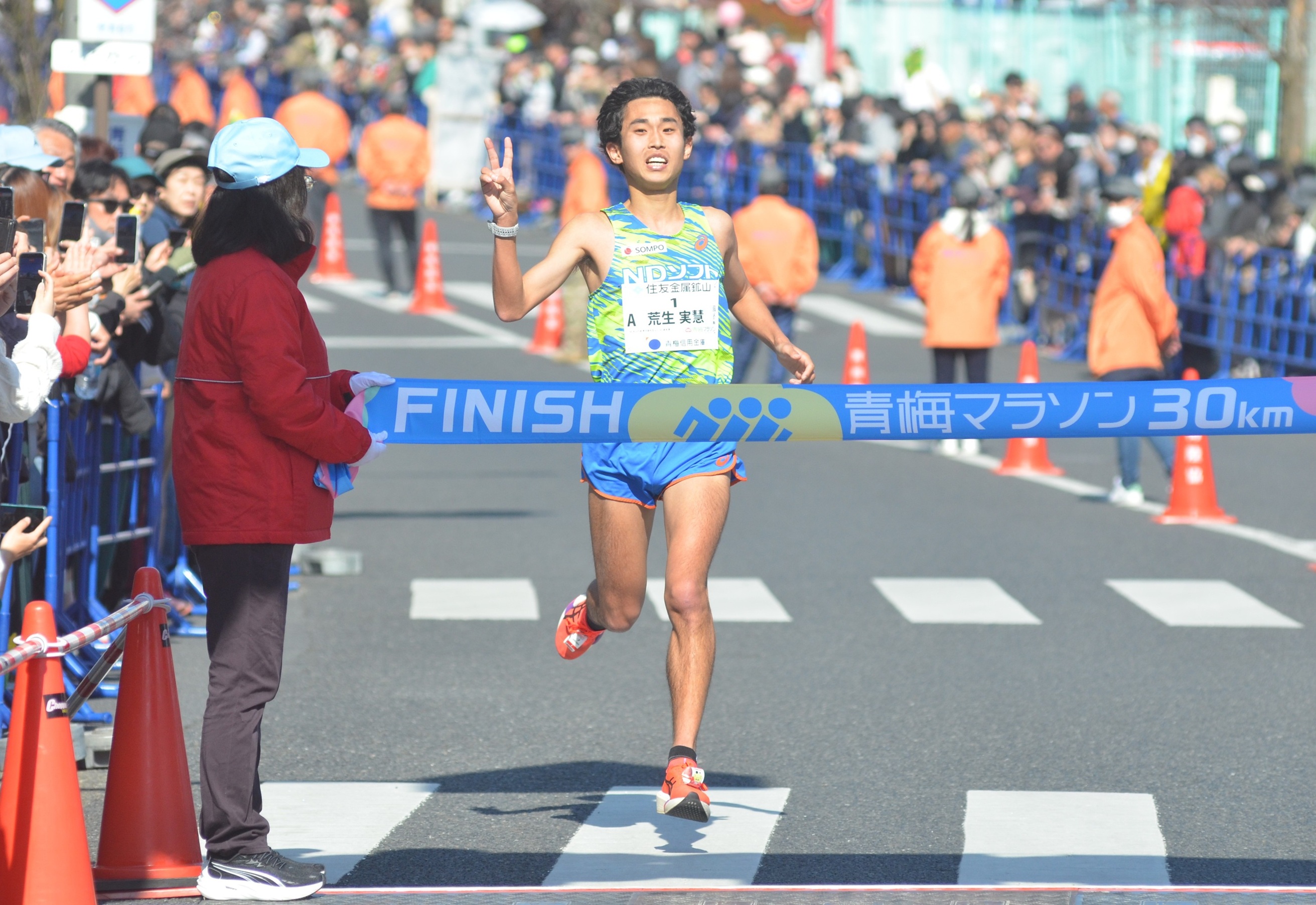 第58回青梅マラソンのメインレース、男子30キロの部は、荒生実慧選手(NDソフト)が、1時間30分54秒で制し、見事大会2連覇を果たしました。