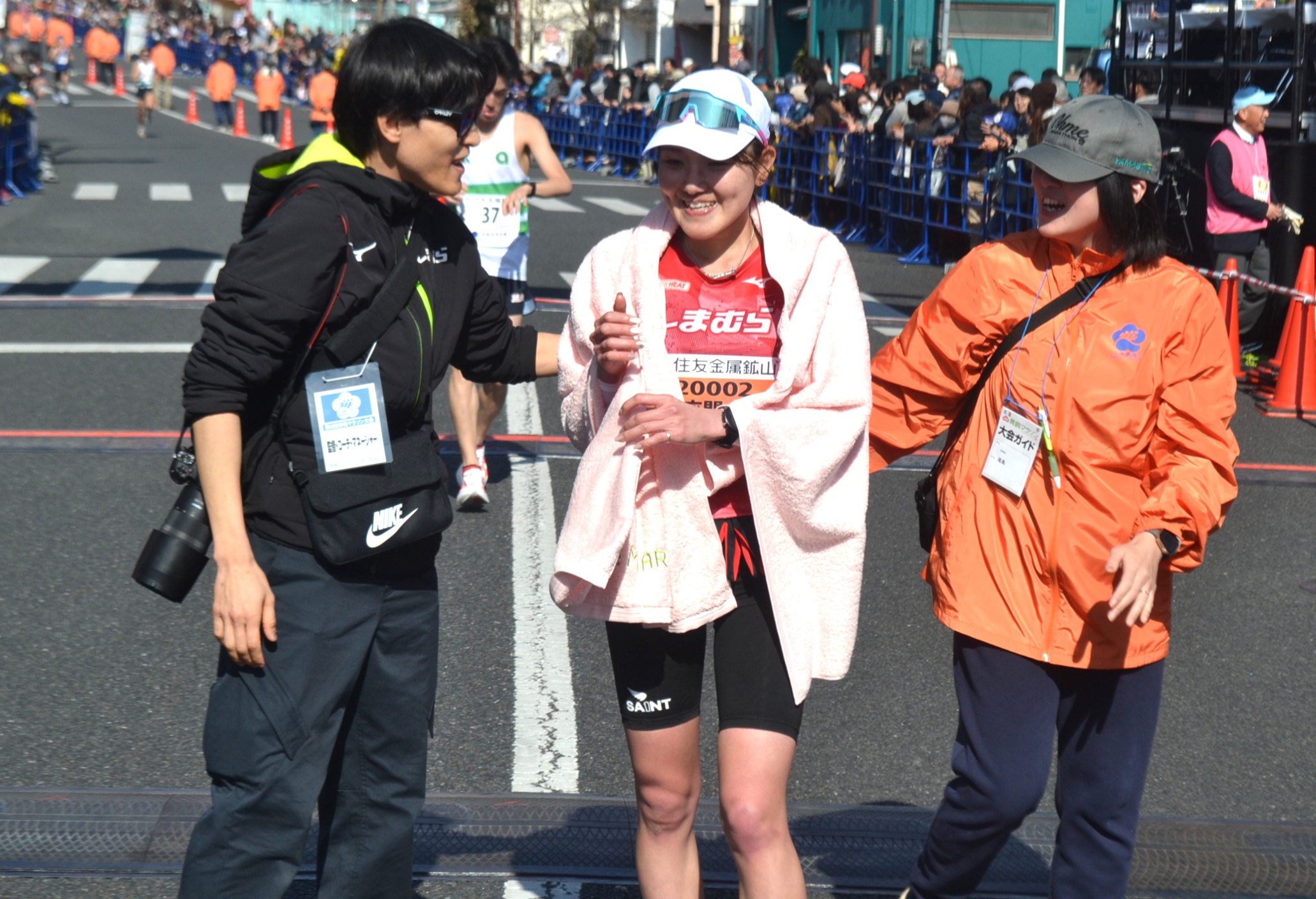 目標としていた1時間44分には1分近く遅れたが、タイムよりも勝つことを優先していたという座間選手。自身の走りに「満足です」と晴れやかな表情を見せました。